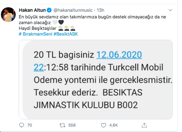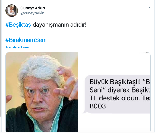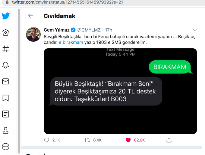 Koyu bir Fenerbahçe taraftarı olarak bilinen Cem Yılmaz ile Galatasaraylı Cüneyt Arkın ve Mahsun Kırmızıgül de Beşiktaş’ın kampanyasına “BIRAKMAM” yazıp 1903’e SMS atarak destek verdi. Sosyal medya hesabından SMS mesajını duyuran Cem Yılmaz; “Sevgili Beşiktaşlılar, ben bir Fenerbahçeli olarak vazifemi yaptım… Beşiktaş candır, bırakmam yazıp 1903’e SMS gönderelim” diye yazdı.