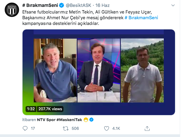 Fenerbahçe’nin efsane futbolcularından Rıdvan Dilmen de Beşiktaş kampanyasına destek veren isimlerden oldu.Aynı dönemde futbol oynadığı Beşiktaşlı Metin Tekin, Ali Gültiken ve Feyyaz Uçar’ın “Bırakmam Beşiktaşım Seni” dediği videoyu yayınlayan Rıdvan, futbolseverleri kampanyaya destek vermeye çağırdı.